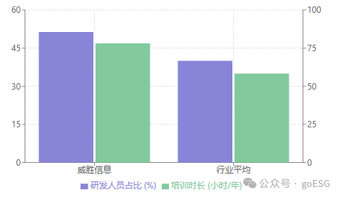 在领先指标方面,威胜信息员工培训时长达到46.83小时/年,显著优于行业平均30-40小时/年的水平。这一指标的驱动因素可从研发人员结构与行业特性两方面分析:其一,公司研发人员占比达51.34%,显著高于行业平均35%-45%的水平,较高的研发人员占比通常对应对技术能力持续提升的需求,进而推动企业增加培训投入以保障研发团队的专业素养;其二,作为能源物联网企业,所处行业技术迭代速度较快,企业需通过系统性培训确保员工技能与行业发展同步,这一内在需求进一步支撑了培训时长的领先优势。